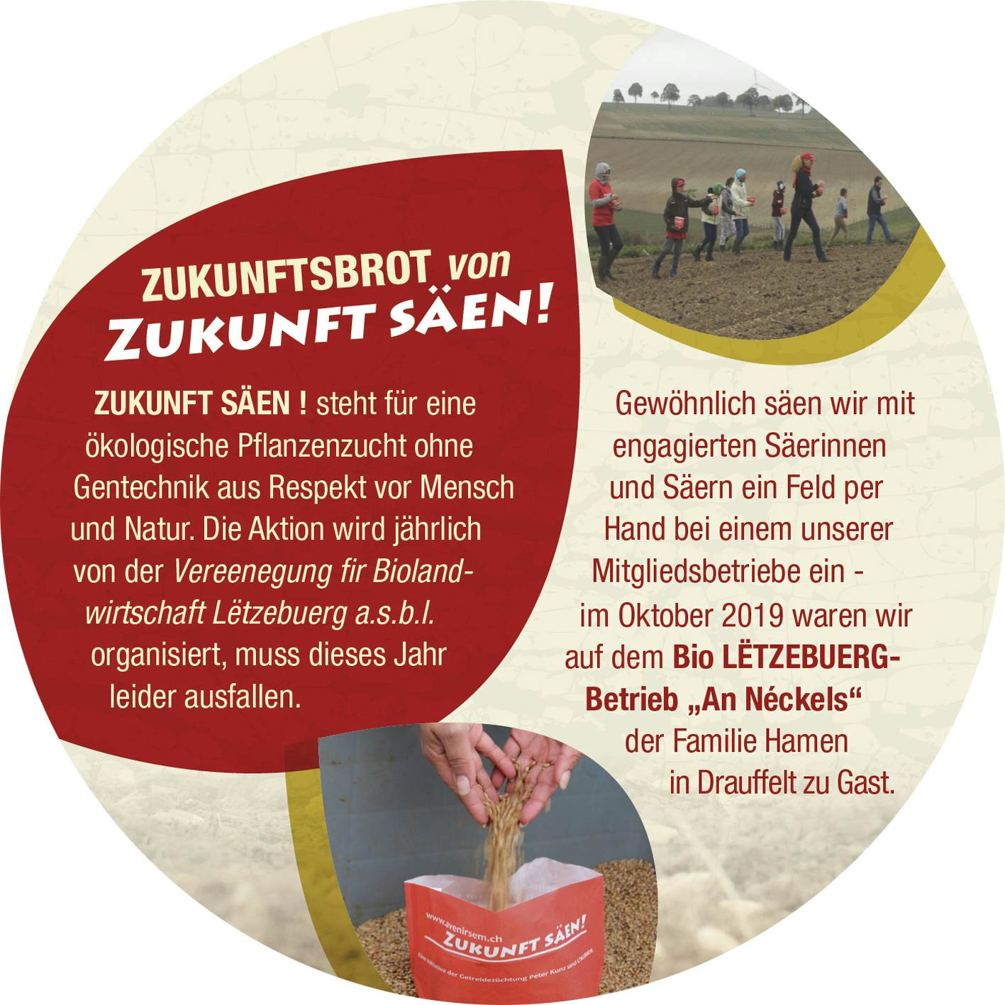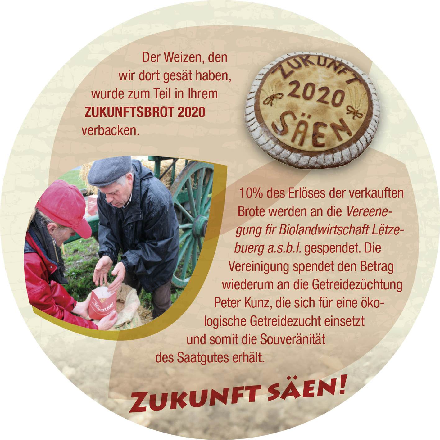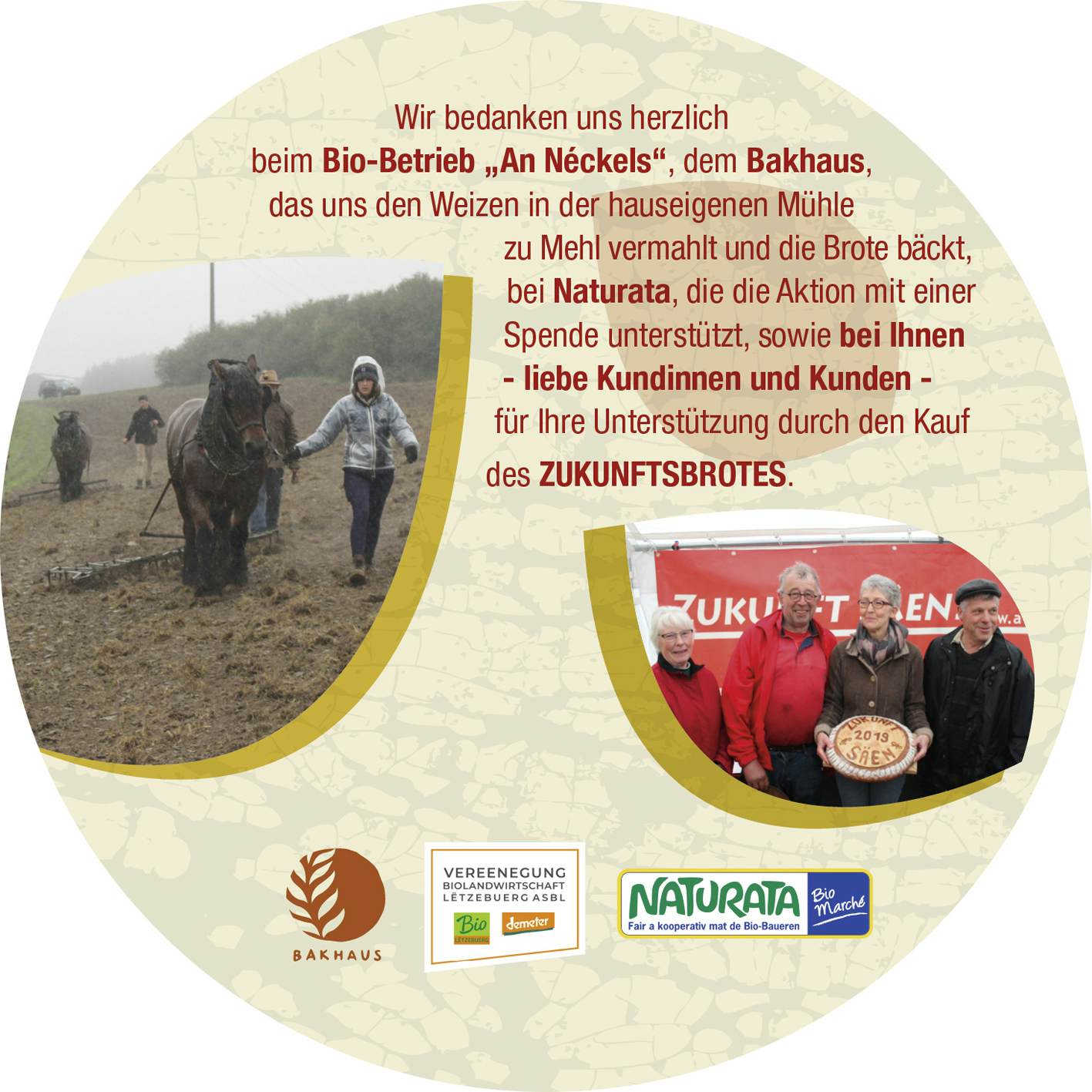 10% of the total turnover resulting from sales of the ZUKUNFTSBROT 2020 are donated to the Vereenegung fir Biolandwirtschaft Lëtzebuerg a.s.b.l. The association on the other hand is donating the amount to the seed cultivist Peter Kunz, who supports the ecological breeding of cereals and thus maintains the sovereignty of the seeds. Consequently, the cycle is closed and the seeds are guaranteed for the following year.